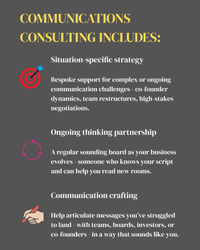 Others surface something bigger – a co-founder relationship that needs structural work, a team communication pattern that runs deep, or an ongoing need for a thinking partners as the business grows. For those founders, Communications Consulting is the natural next step.